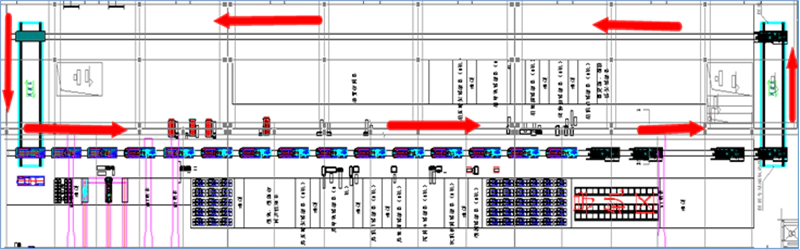 - Dual-track layout: long tracks alongside both production lines, short vertical tracks at either end